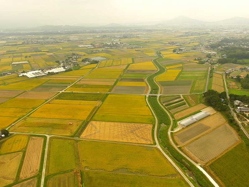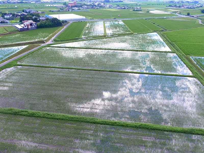 農業のスマート化が進められています。そのひとつがドローンを活用した農薬散布と田んぼや畑の空撮です。上空から撮影した動画や画像を解析し、稲の発育状況や稲刈りの時期をデータを見て判断できるようになり、今後の栽培に役立てることができます。
